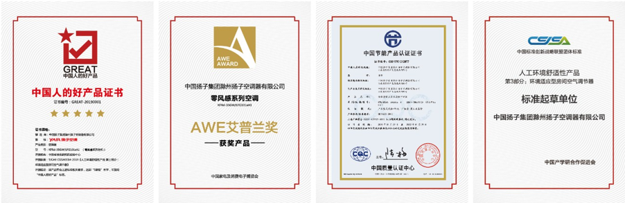 凭借着技术优势,扬子零风感空调在行业内得到了高度赞赏,产品经中国标准化研究院测评,其热舒适性指标均能达到最高等级的“5星标准”,并获得由CSC颁发的“中国人的好产品”证书;在AWE2019盛会上,被行业协会授予家电行业奥斯卡奖的“艾普兰环保奖”;作为牵头单位,制定了《人工环境舒适性产品第3部分:环境适应型房间空气调节器》的团体标准;产品能效比达4.73,超过国家1级能效标准,荣获“中国节能产品认证”证书,并入围国家工信部绿色设计产品。以上奖项的获得,彰显出扬子空调不凡的技术实力与创新能力。