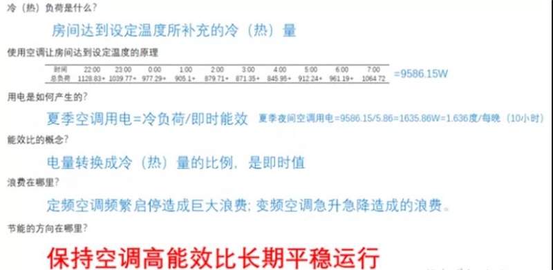 随后,曾总就冷(热)负荷做了详细的说明,让大家深刻的认识到使用空调让房间达到设定温度的原理,与此同时,曾总还就用电是如何产生的?什么是能效比?浪费在哪里以及节能的方向在哪里?这几个问题做了深入浅出的讲解。